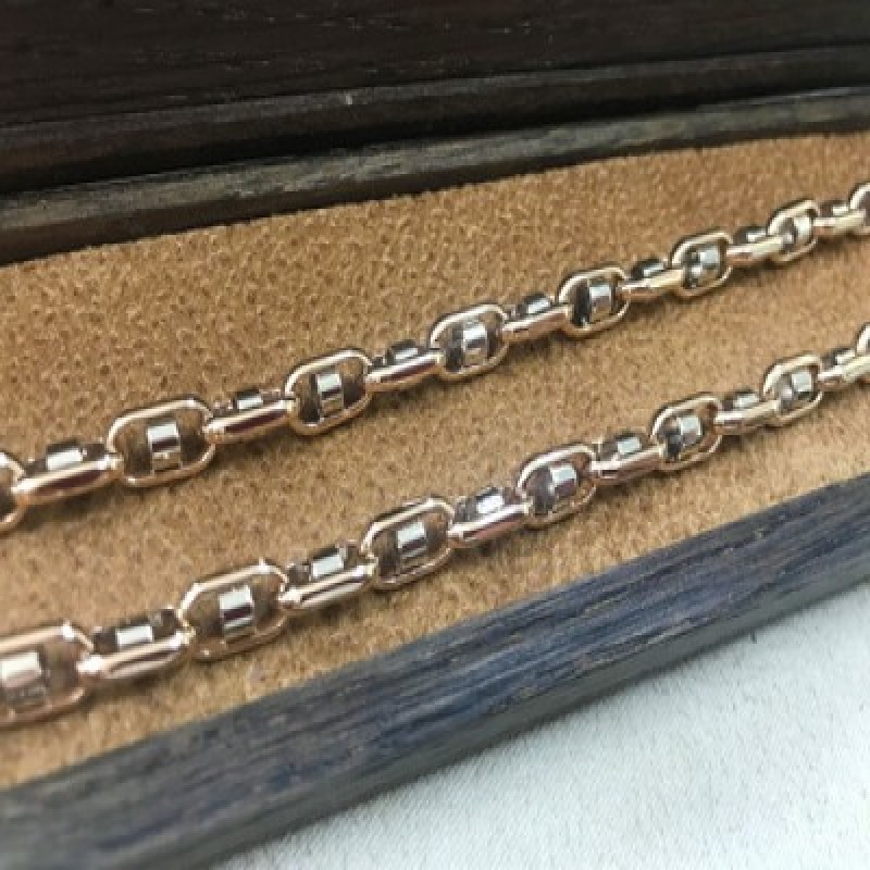 Мужская полновесная цепь и красного и белого золота 585 пробы .Все наши ювелирные изделия имеют клеймо государственной пробирной палаты 585 пробы, и клеймо производителя. На каждой бирке имеется QR код с цифрами которые можно ввести на сайте ГИИС ДМДК и проверить подлинность ювелирного изделия. (Все официально выпущенные ювелирные изделия можно проверять на сайте ГИИС ДМДК